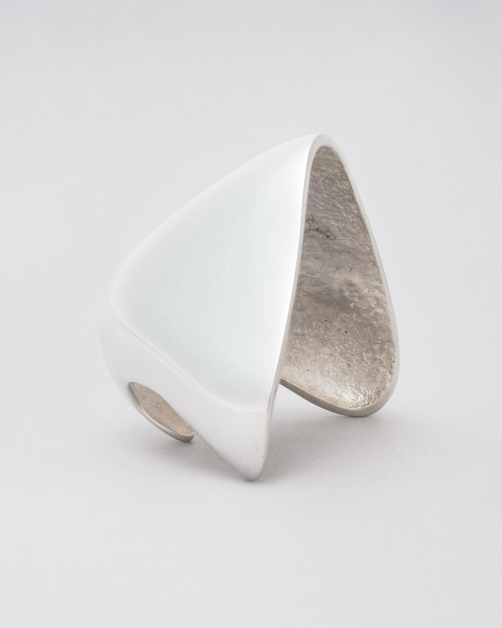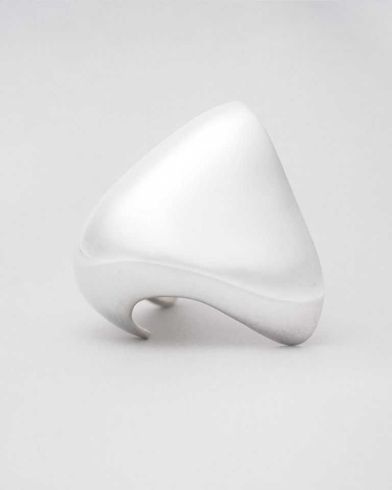 The nose — On the inside it’s a silver negative of the artists nose, capturing its precise texture and conture. The outside — the high polished mirrored warped surface is the vanishing point made physical. space compressed into a tiny gleaming point.