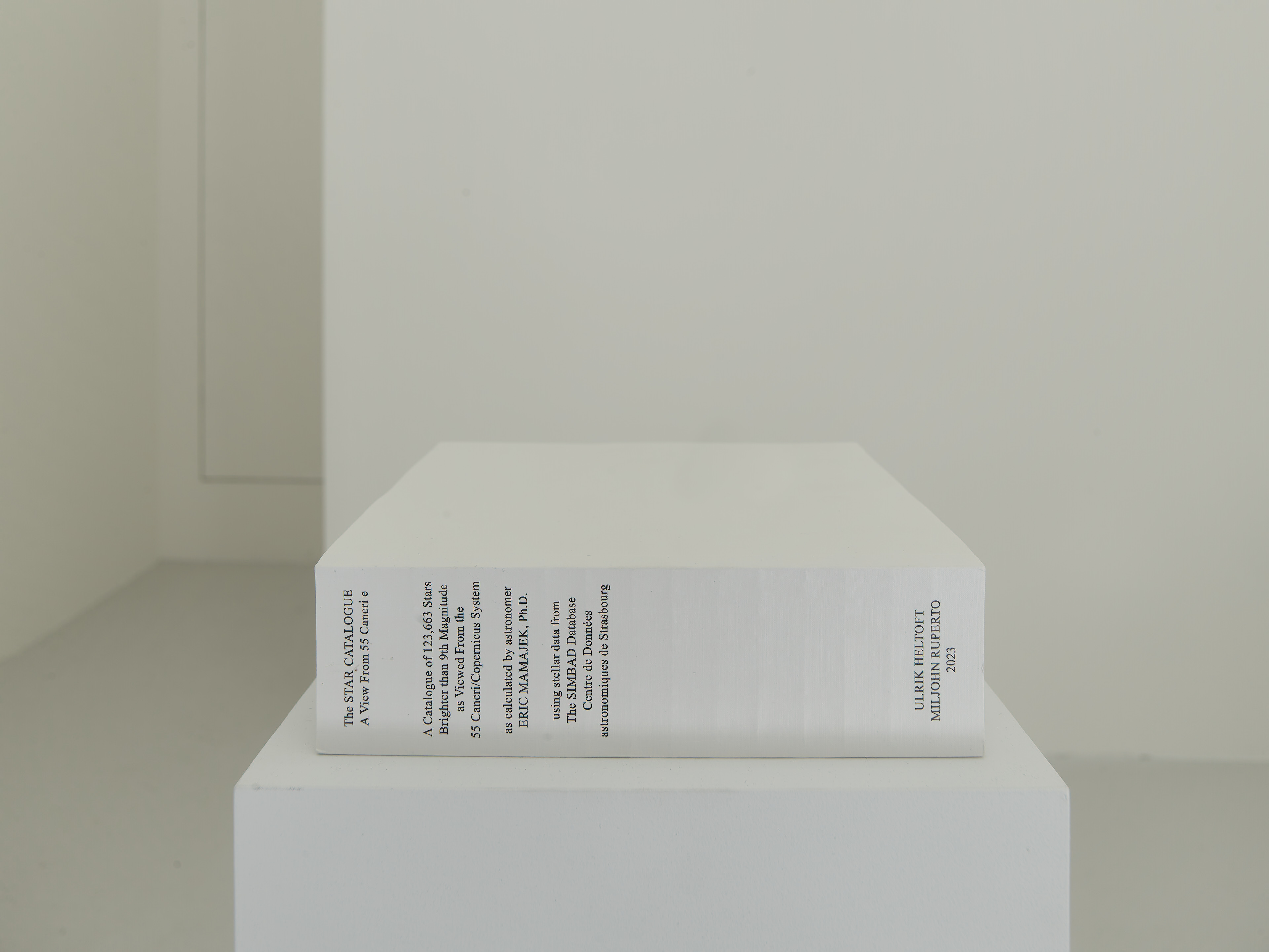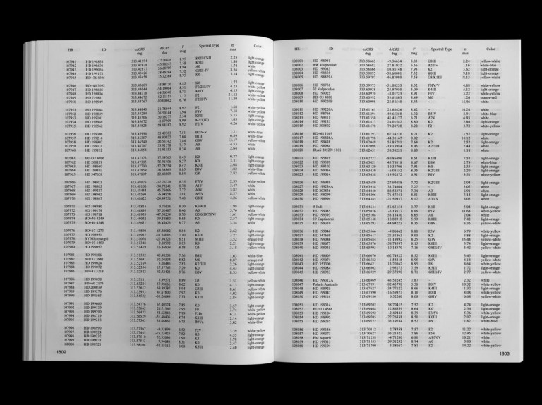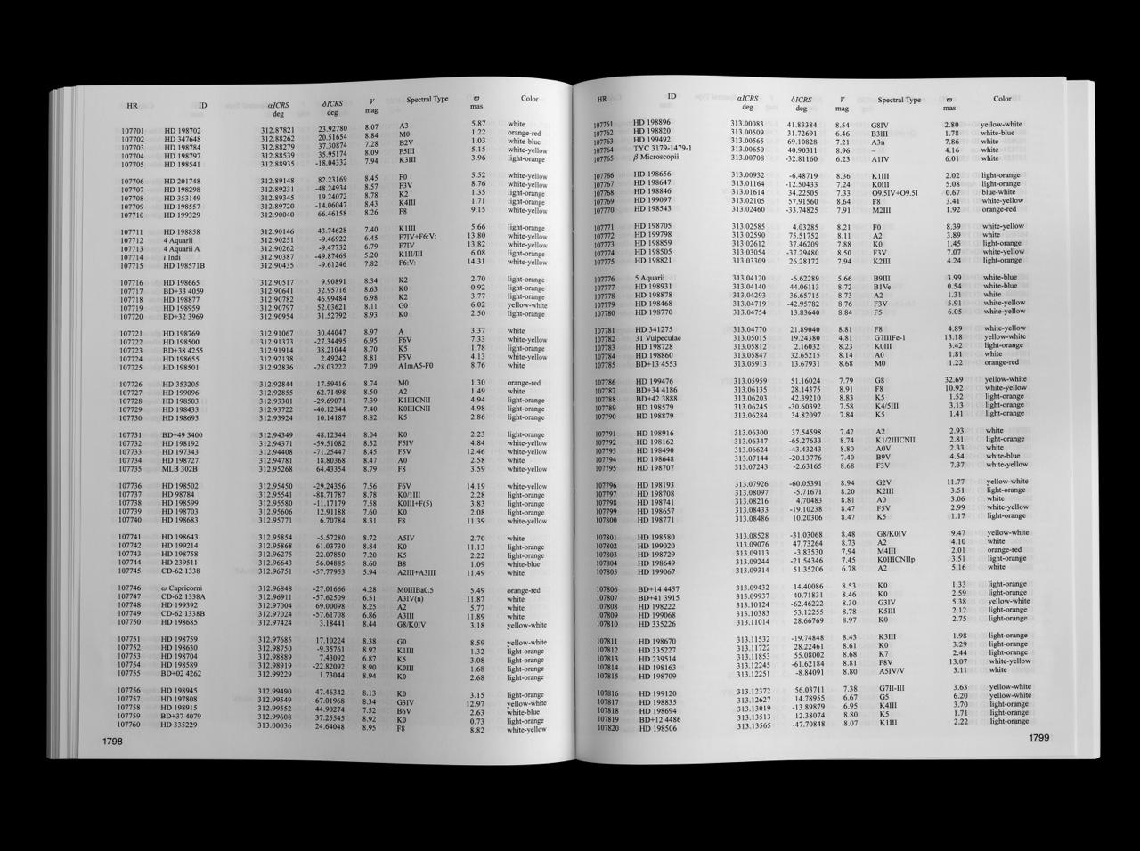 The book — a two-thousand page star catalog, lists the stars in view from 55 Cancri / Copernicus system, along with their coordinates and qualities. The gaze is reversed, and the Sun is dissolved into the visible 123,663 points of light, as seen from Cancri 55e.