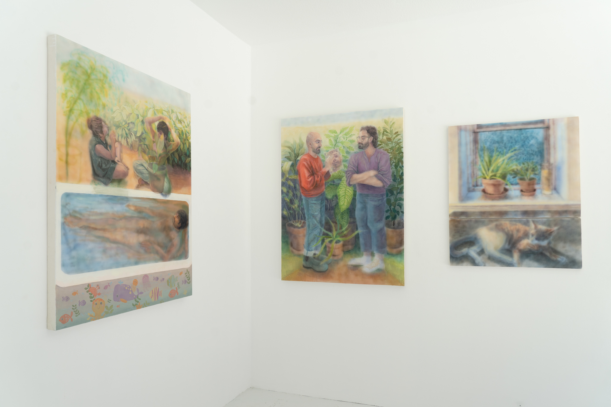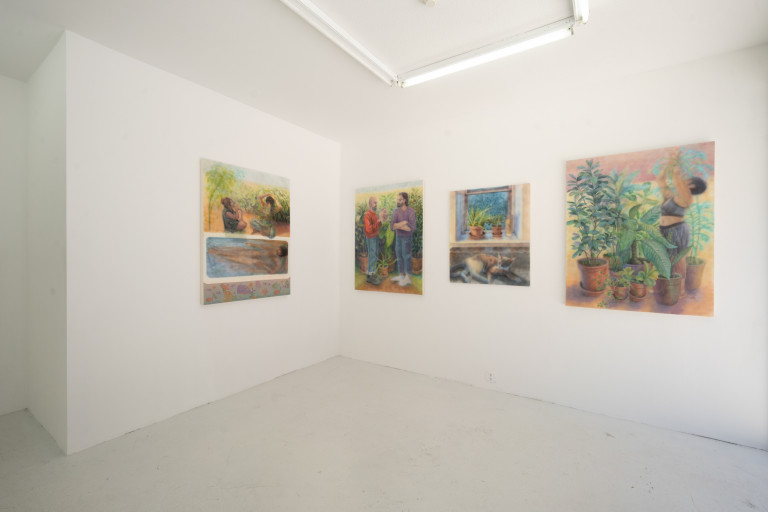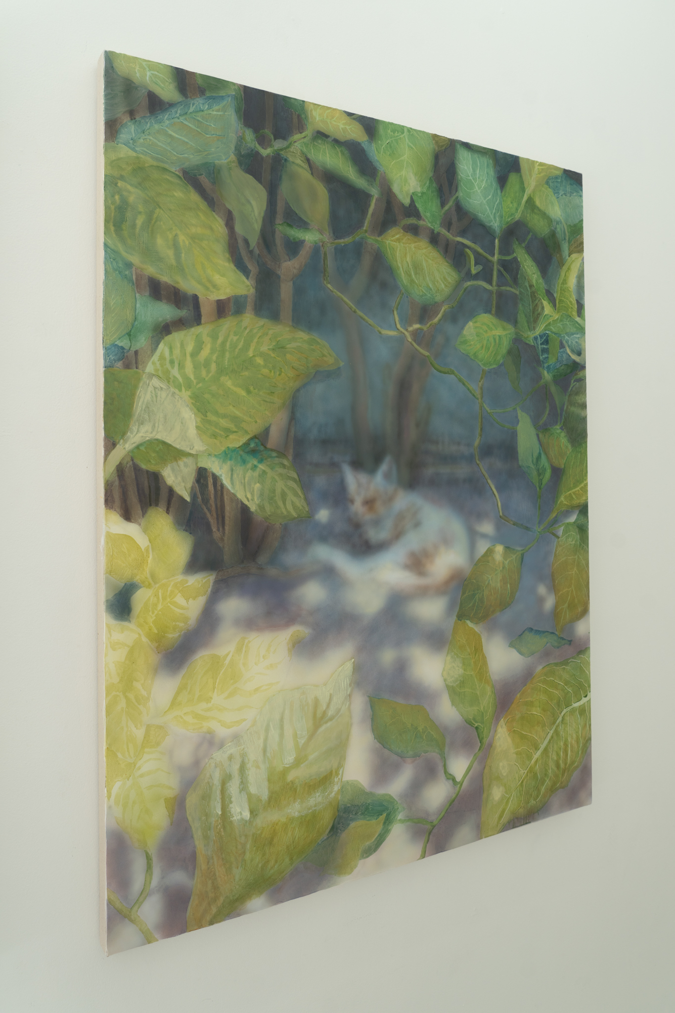 Shivering in and out of focus, Fiza Khatri’s Confidant configures a series of paintings that treat the interior as exterior and vice-versa. Sharpened vines frame the softened shape of a cat seeking respite from the sun. A hazy figure stretches while inter-twined with potted houseplants whose containers and leaves reach forward with rendered clarity. The background/foreground dichotomy so familiar in the Western canon of painting is forgone in favor of a wash between the two. The technique describes a sense of memory – the periphery of a feeling.