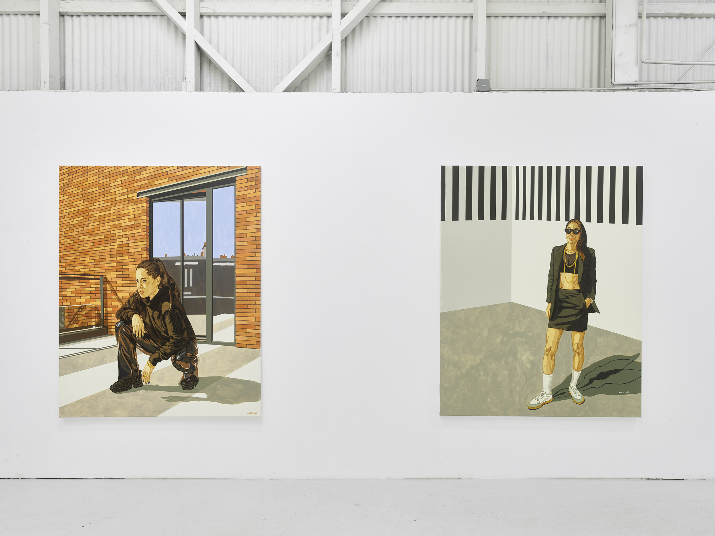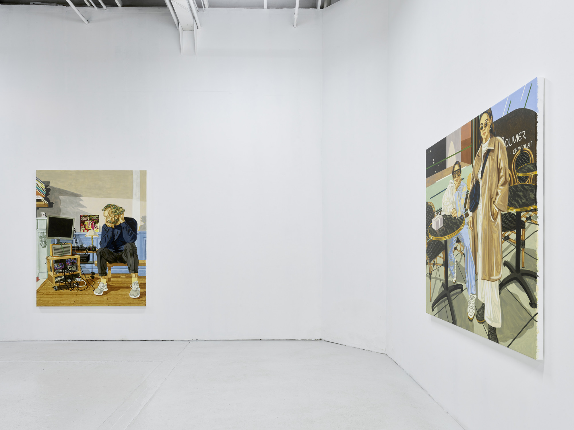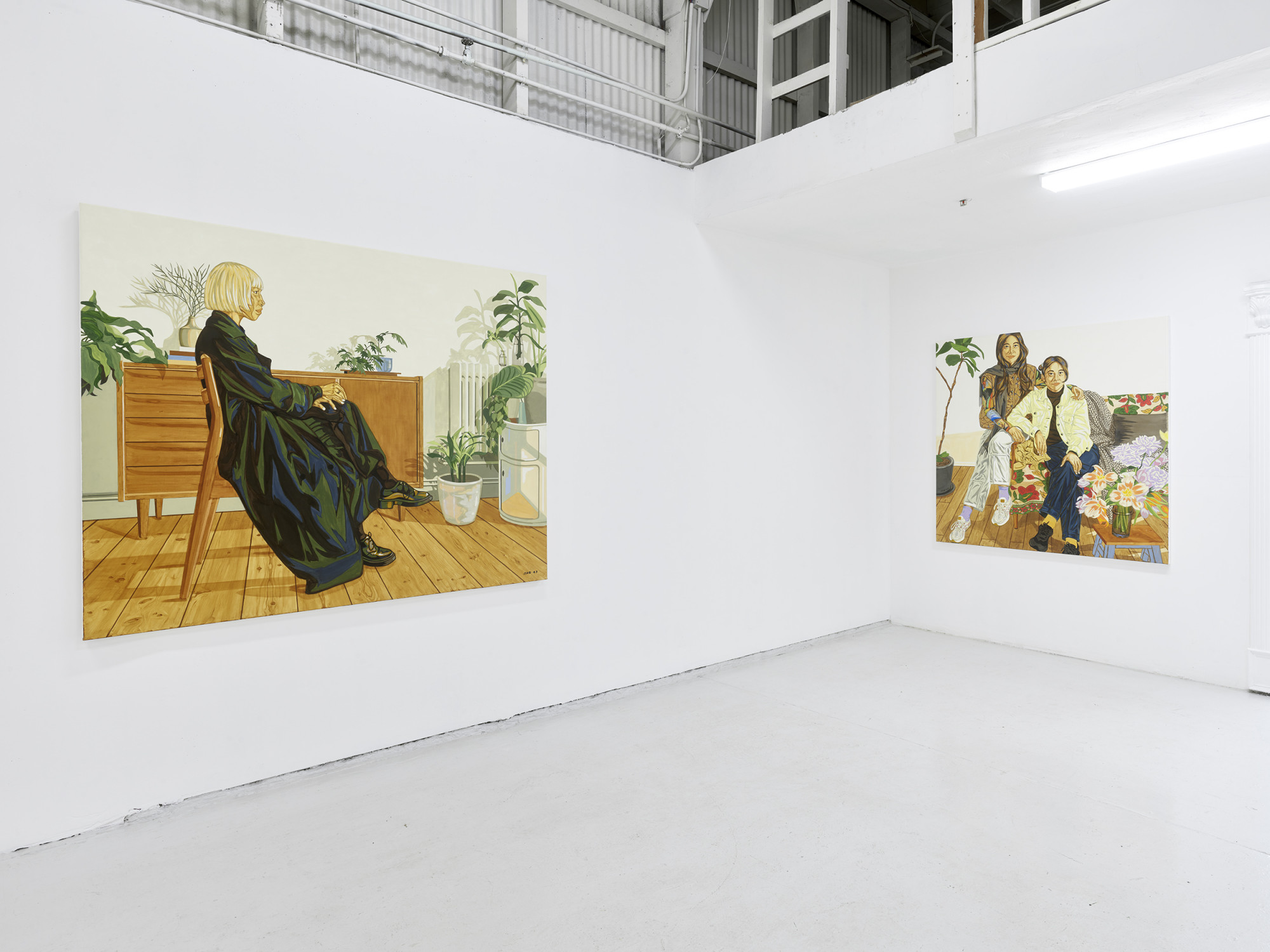 For the artist, depictions of friends and frequent sitters inform and reveal her own being. They are not self-portraits, but rather, works about seeing the self through another. A portrait of two German-Japanese sisters—who Prachakul met at a ramen house in the twins’ hometown of Berlin—opens onto the lives of individuals who, like the artist herself—currently based in Vannes, Brittany, France—are often part of the global Asian diaspora. Within the genre of portraiture, which establishes the importance of an individual and traditionally disregards diasporic experience, Prachakul brings into cinematic focus subjects who are often caught, ever so slightly, off camera. Disguised in sunglasses or a trench-coat, or pictured in a downward glance, lost in thought, sometimes eyes slightly emptied with an awareness of being watched, her sitters gain the agency to be seen not by a hierarchical gaze, but to be seen as a peer, to look to each other, to their families and companions, to the eye of themselves.