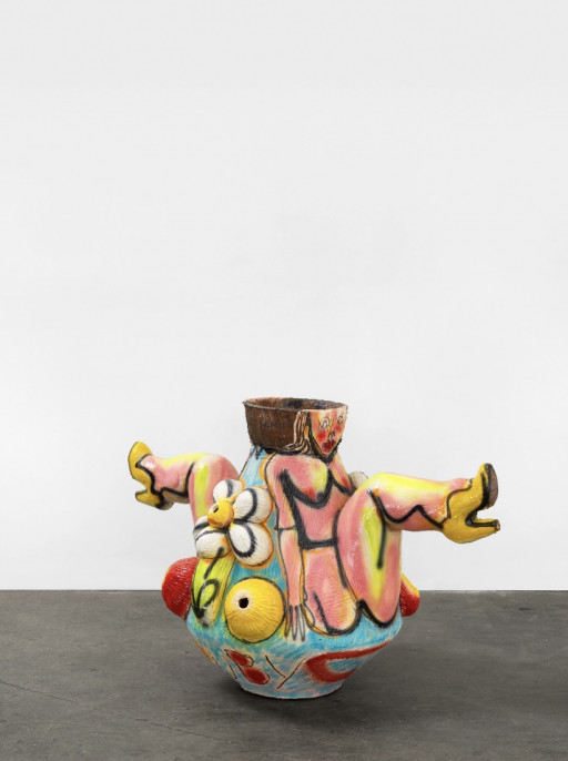 In my in-between times these days I’m listening to an audiobook in which a Jungian analyst tells fairy tales in a disarmingly sexy voice. In the latest tale a naive girl is tricked by jealous village girls into throwing the heirloom necklace her grandmother gave her into a lake. In despair she flees to the forest, where she meets an old woman covered in scars and raw wounds that are hot-pink as the tits on a clay sculpture by Ruby Neri. The old woman tells the girl she can help her retrieve her legacy necklace if the girl kisses and licks each of her wounds and scars. Squelching her repulsion, the girl licks and kisses them tenderly, and the old woman experiences great relief. The old woman then whirls the girl over her head and throws her in the lake, where she sinks down down down, discovering she can breathe under water. In a grotto she encounters another old woman who is beautiful and whole, and wearing the legacy necklace she lost. The old woman thanks the girl for healing her sister. Then she bedazzles the girl’s legacy necklace with a hundred gems that flash across her neck gaudy as Chris Johanson’s bubble heads. When the girl returns home, the jealous girls go all gaga over her necklace. They too throw their legacy necklaces into the lake and follow the girl’s path. When they confront the gross old woman they refuse to lick and kiss her wounds, so when she throws them into the lake, they cannot breathe under water, and the monster that lives there eats them.